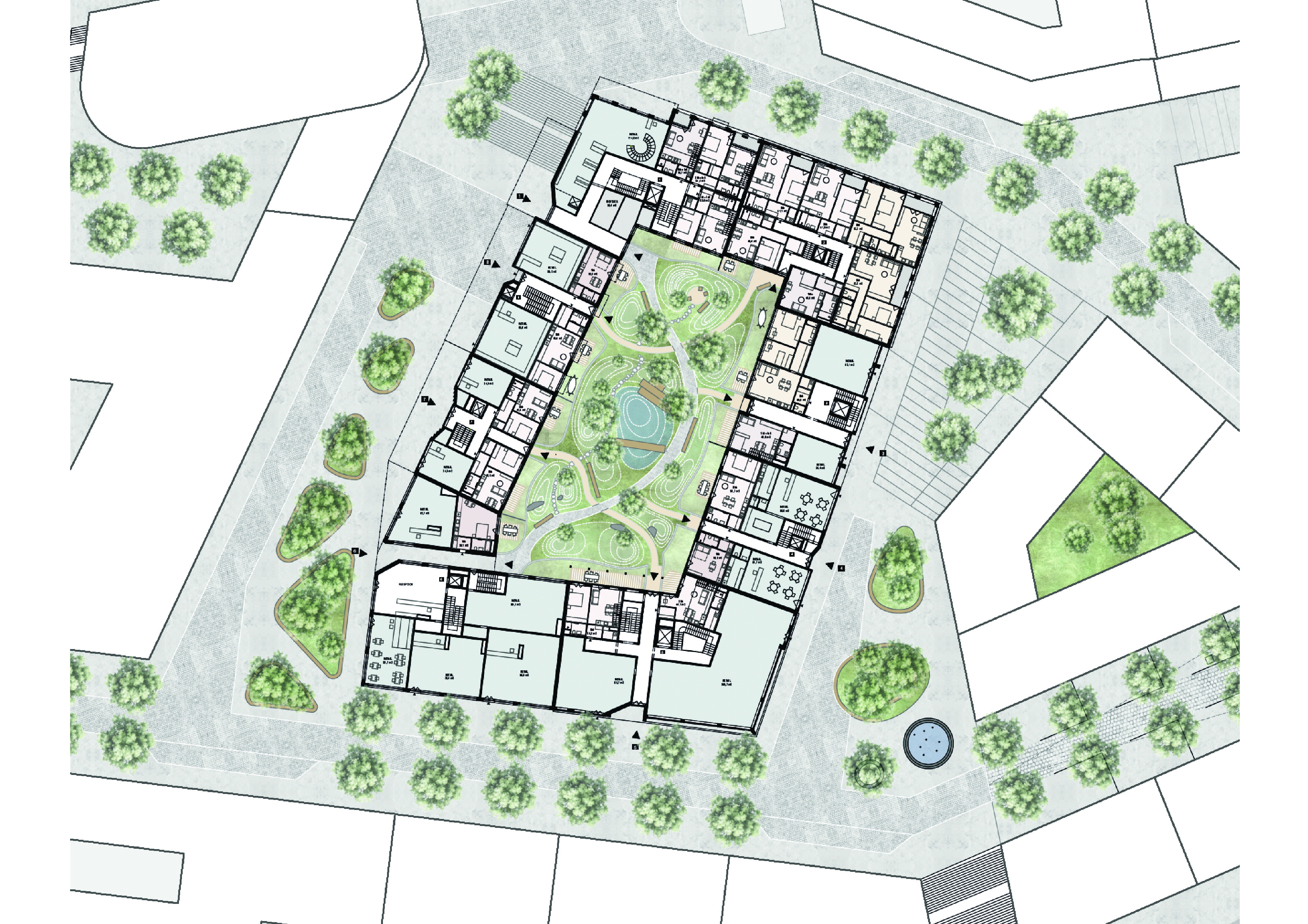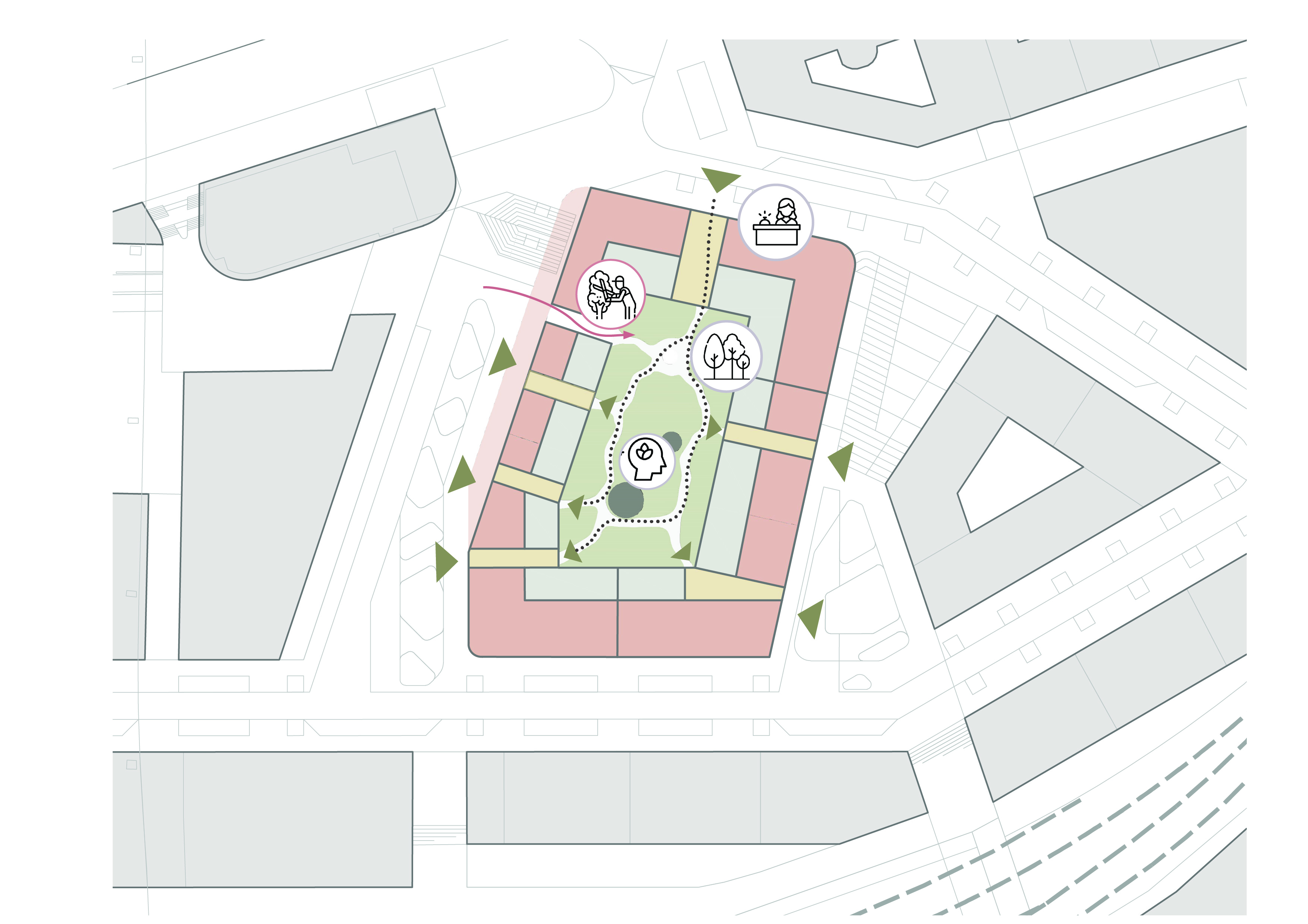 Varied building volumes create identity and orientation, while human-centric spaces—rooftops, courtyards, and ground-floor areas—encourage community, privacy, and social interaction. Active ground floors and engaging roofscapes enhance the public realm, while generous green spaces promote biodiversity and better microclimates.