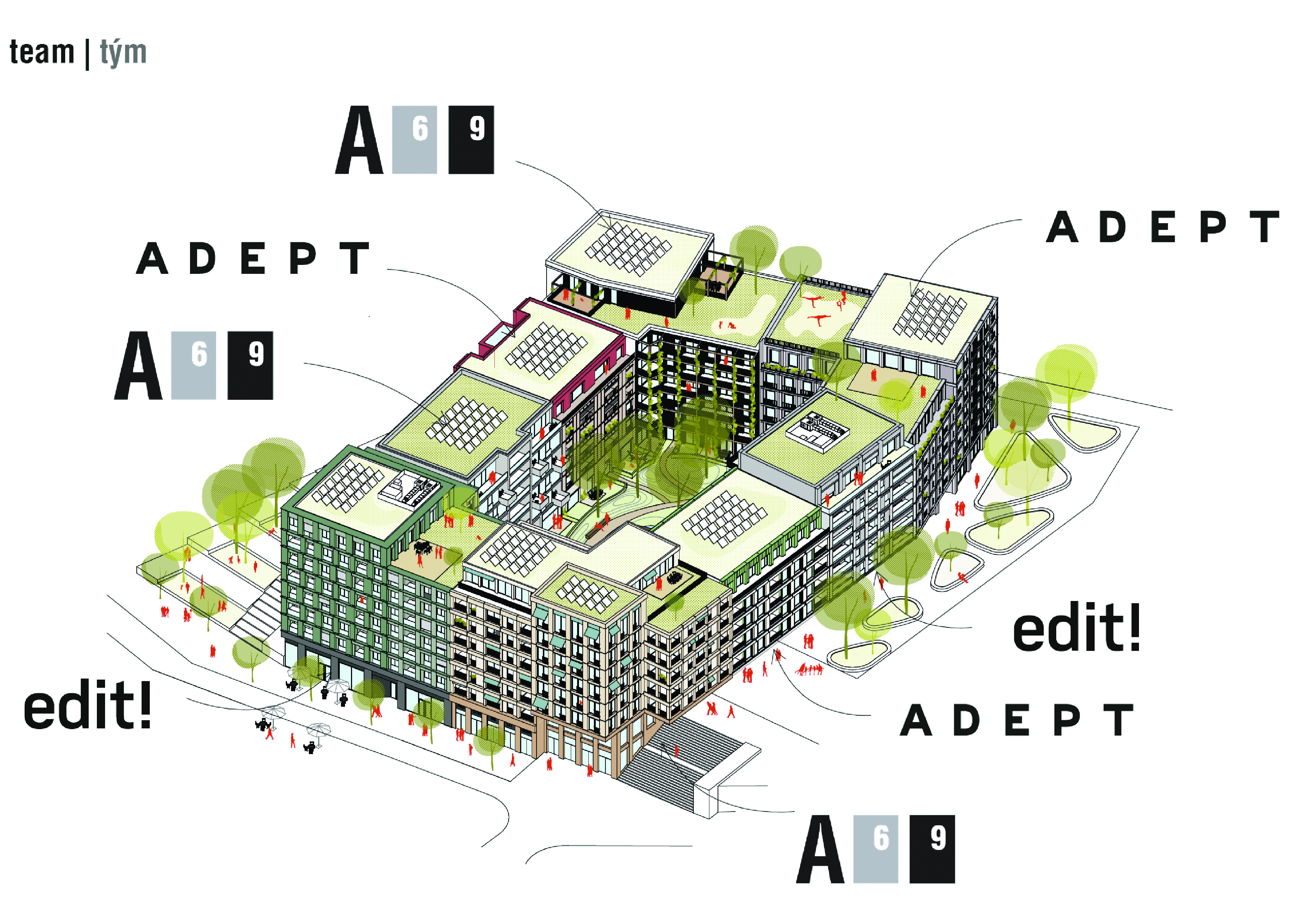 COOPERATIVE BLOCK – we propose a block that is considerate to both the environment and its inhabitants. This cluster of residential buildings fosters the creation of good neighbourly relations within the block, the street, and the city as a whole.