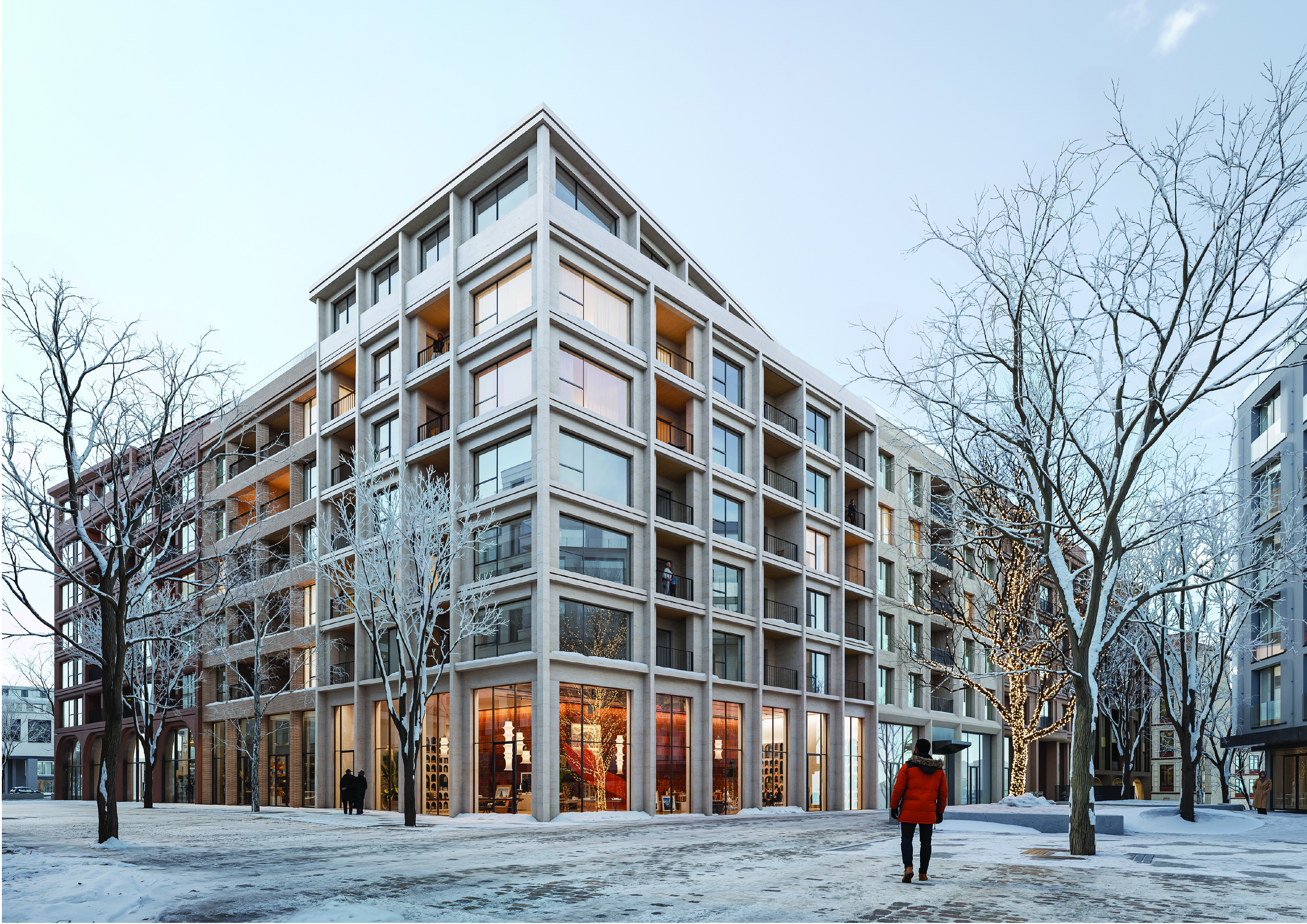 Block B02 reinterprets the foundations of the Prague block: a closed form, with aligned and rhythmic facades, animated by expressive corners that mark the city. Ten clear and legible buildings compose the whole, organized in three parts: an active commercial base, a central body of housing, and a lived-in crown.
