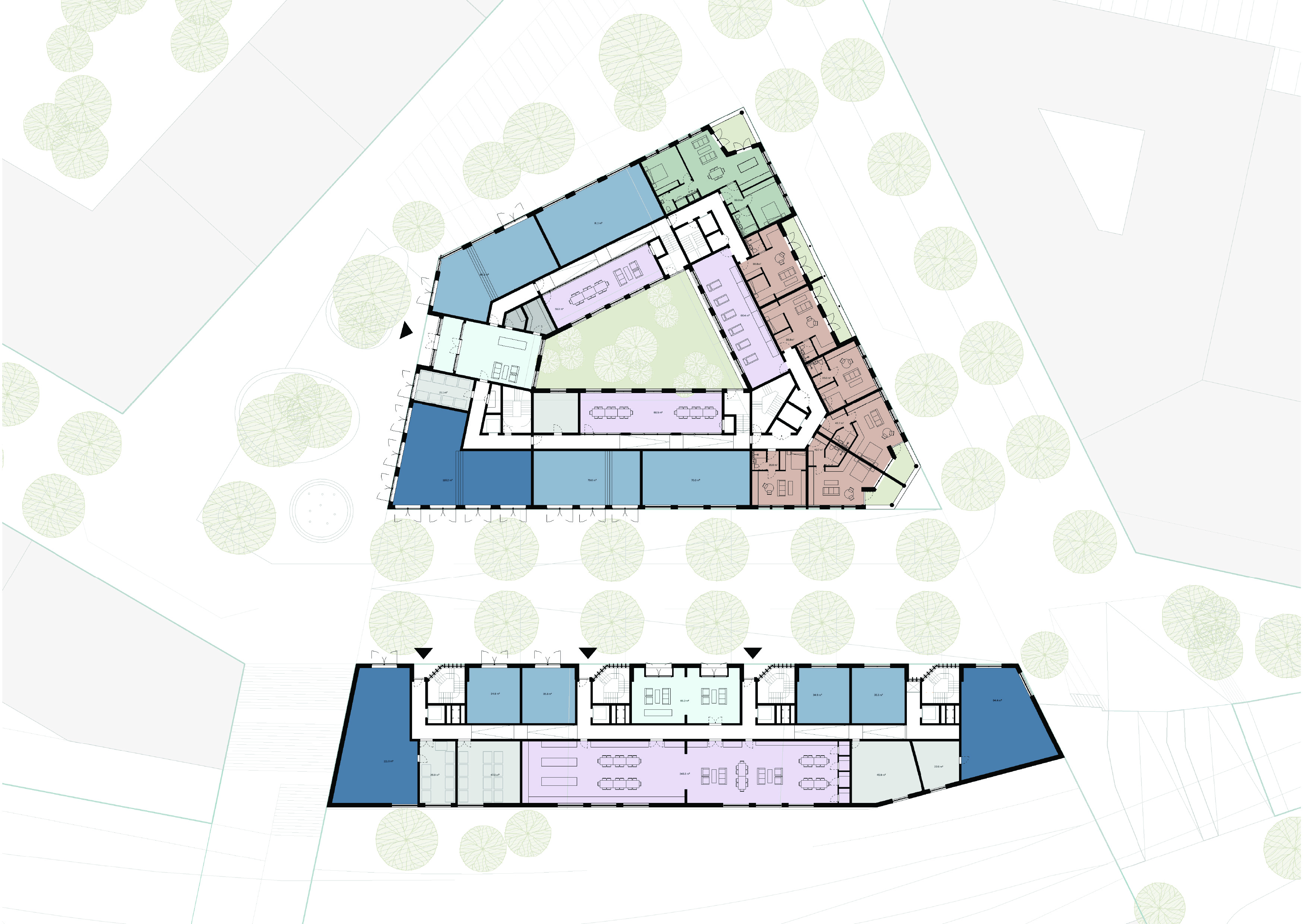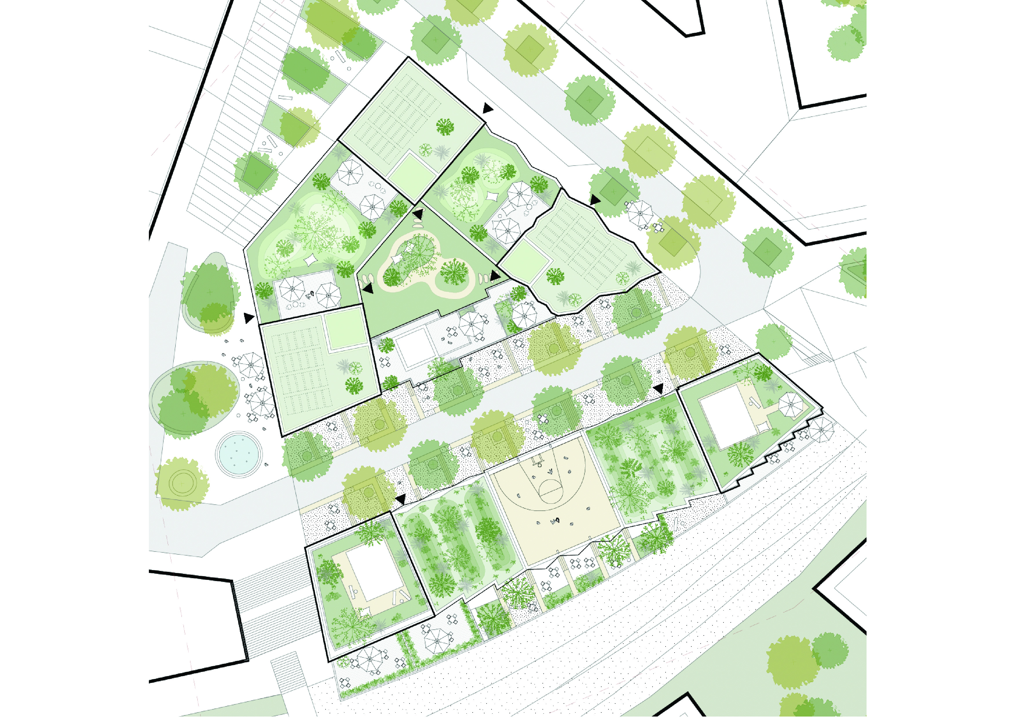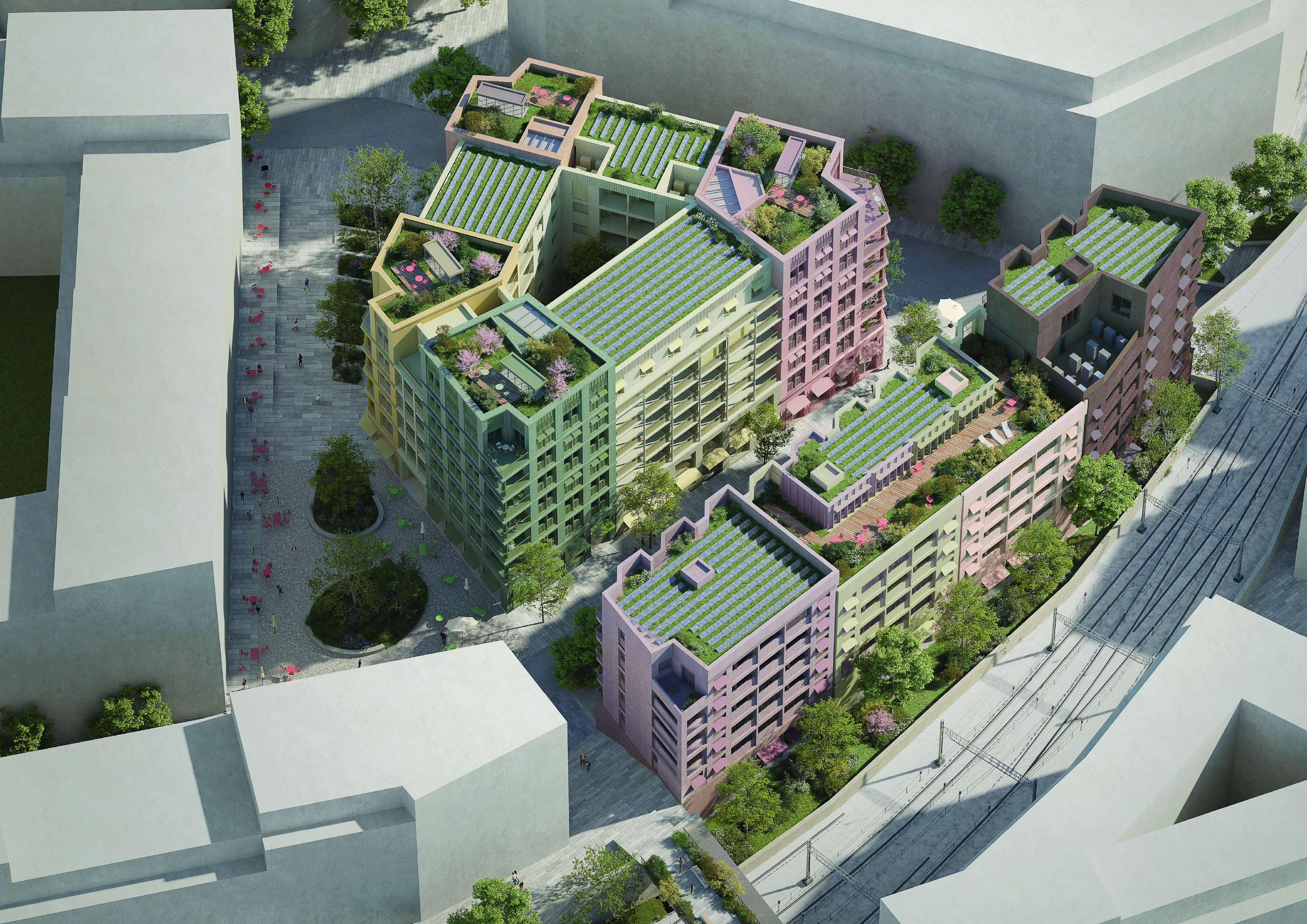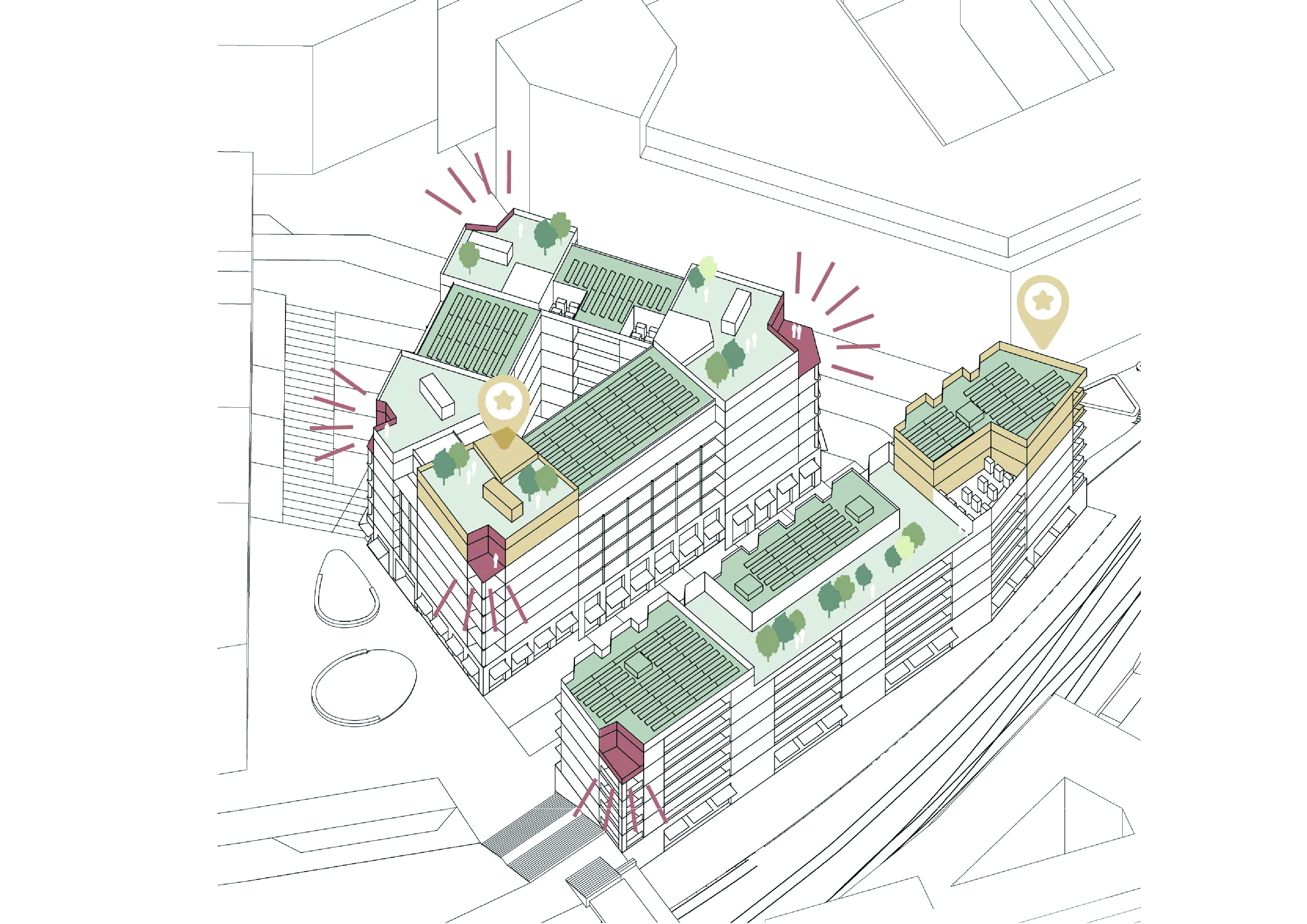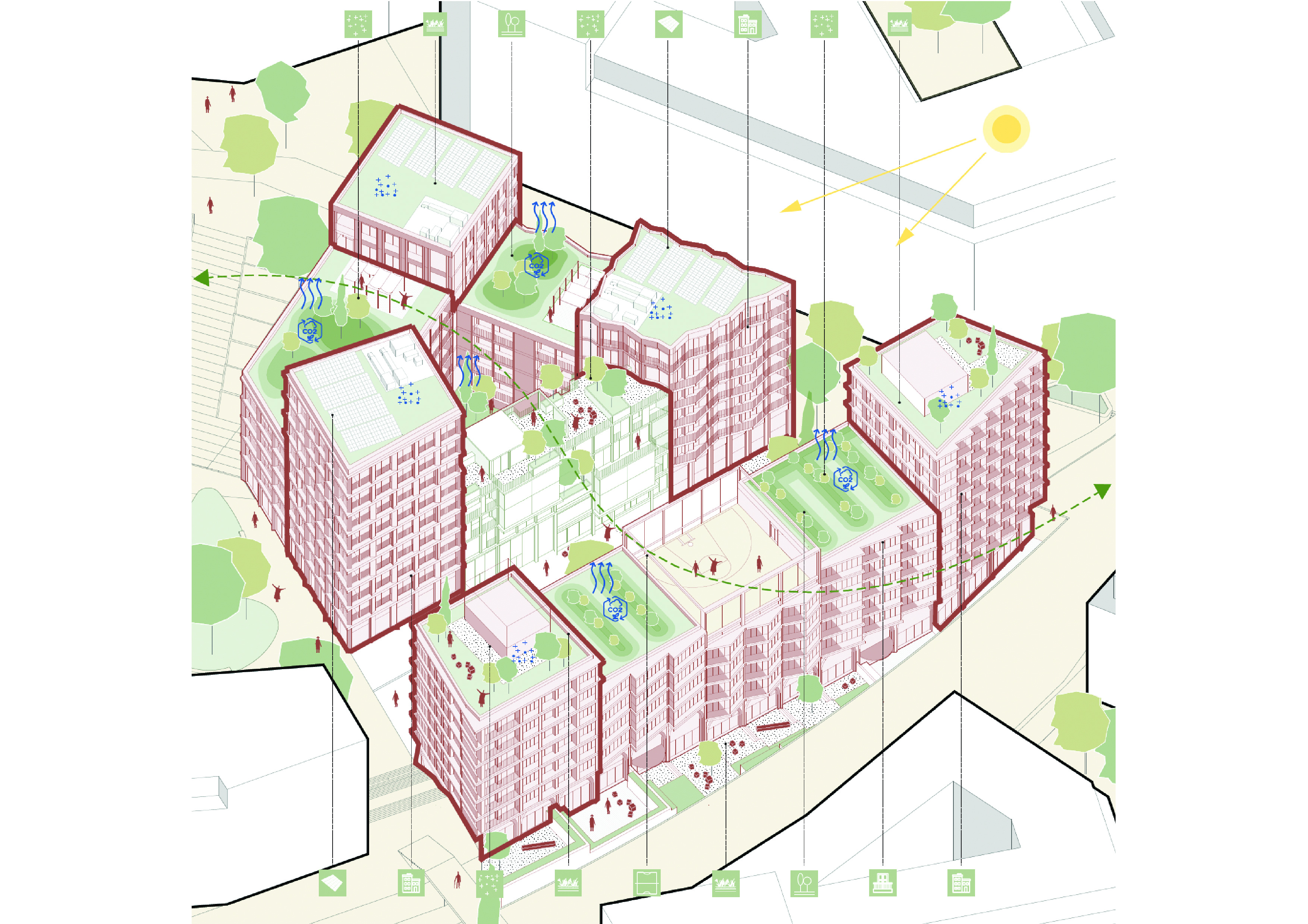 An expressive roof topography creates a lively, ecological landscape for green spaces, water retention, and solar energy generation. A simple, flexible structure supports sustainable surfaces and opens potential for a circular economy.