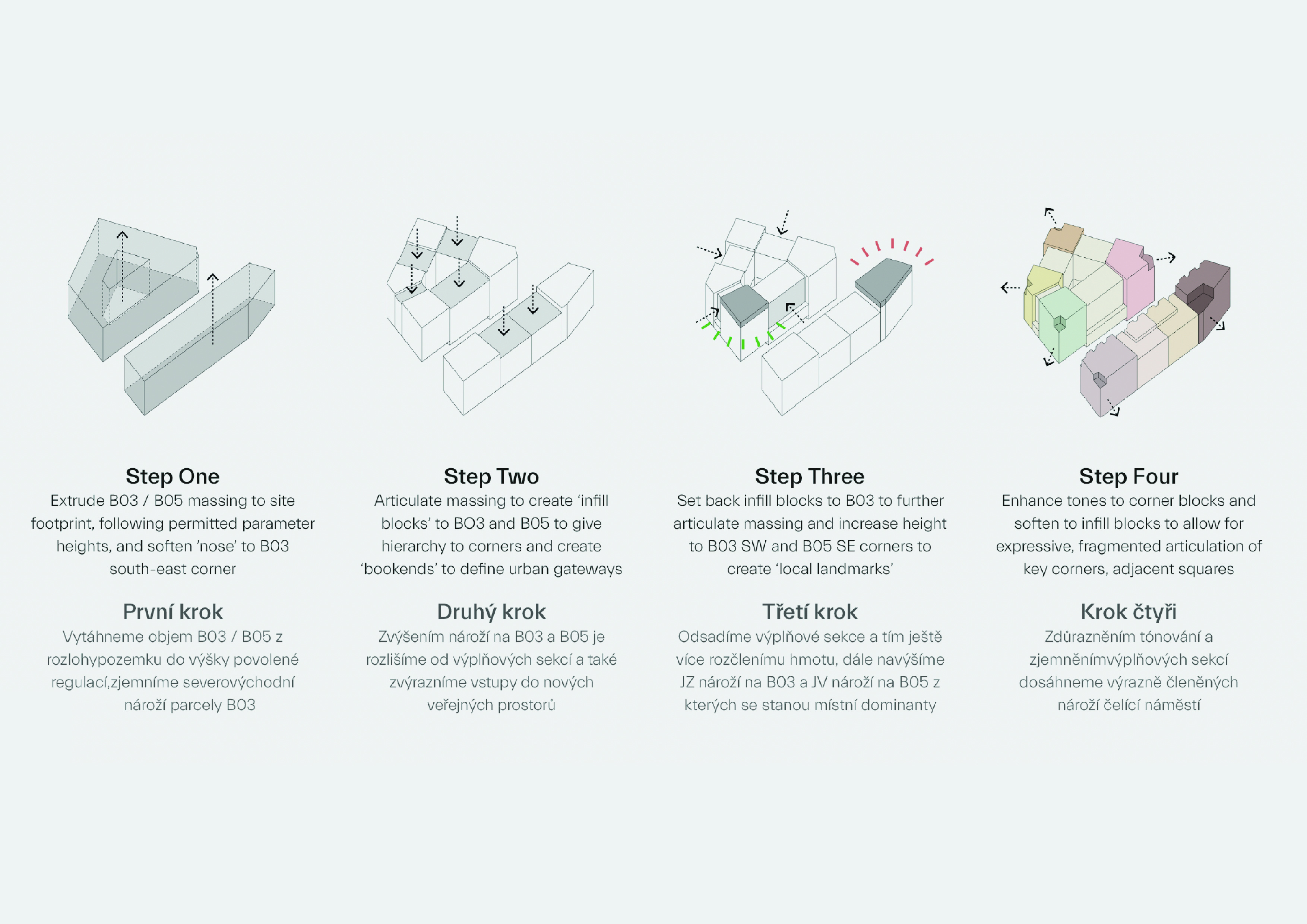 A premium residential project develops the traditional Prague block structure with an emphasis on corner landmarks, high-quality public spaces, and a diverse architectural expression. The corner towers naturally grow out of the urban landscape, offering unique views while resolving problematic corners of the tight inner courtyard, thus enabling residential units to be placed in the most attractive locations.
