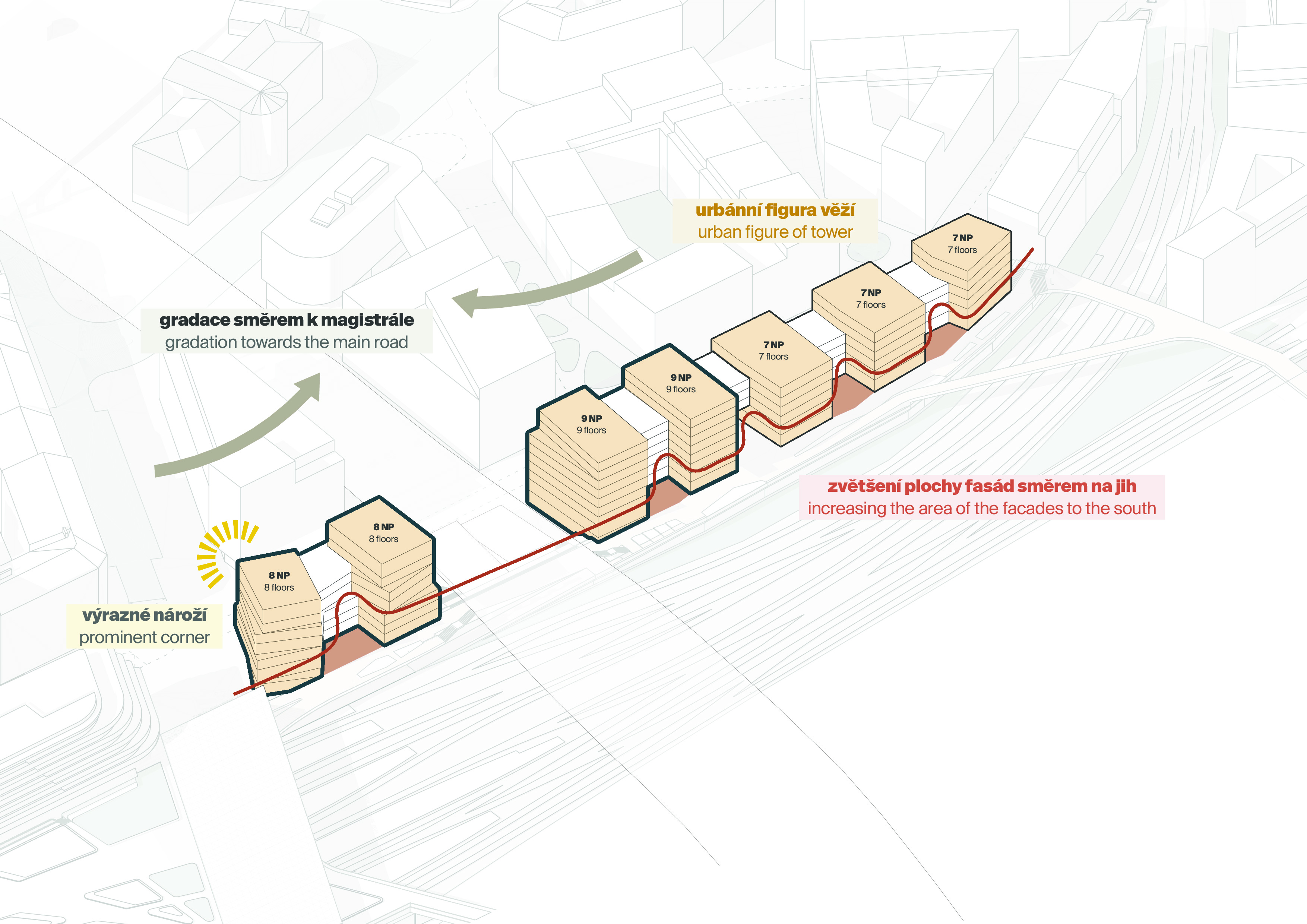 Block B04 marks the southern edge of Florenc, between compact city fabric and railway infrastructure. Buildings are conceived as layered volumes working on multiple scales: from afar, clear silhouette of simple coloured masses is percieved; at pedestrian level along streets and promenade, details and textures emerge. Despite diversity, all follow the same principles – a strict geometric grid and simplicity responding to context.
