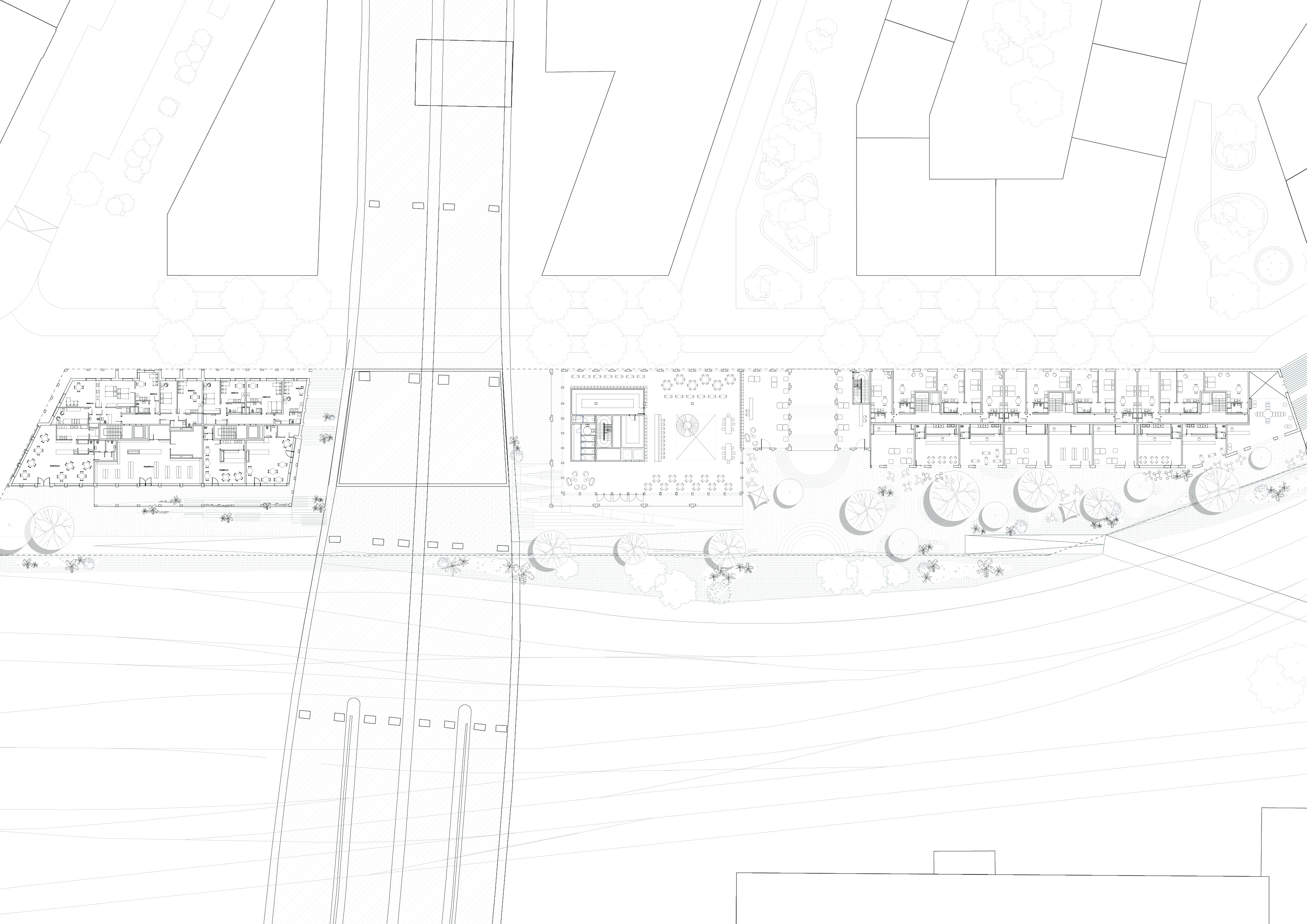 We perceive the defined area as a single entity, approached through a unified strategy of massing. The built volume is divided into functional units, resulting in three distinct buildings. These are complemented by green courtyards, creating a diverse range of public, semi-public, and semi-private spaces. By inserting green courtyards and a passage to the railway promenade we articulate the massing and give the project a tangible human scale.