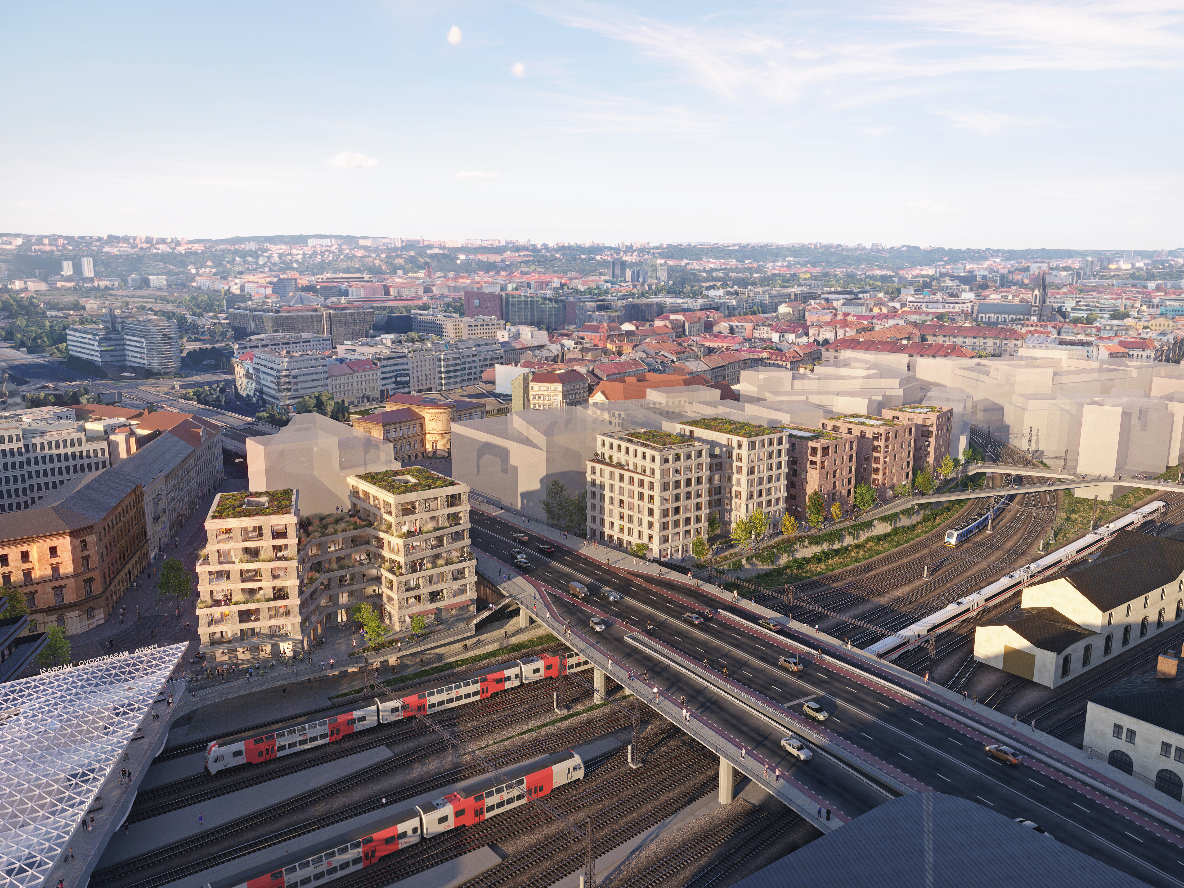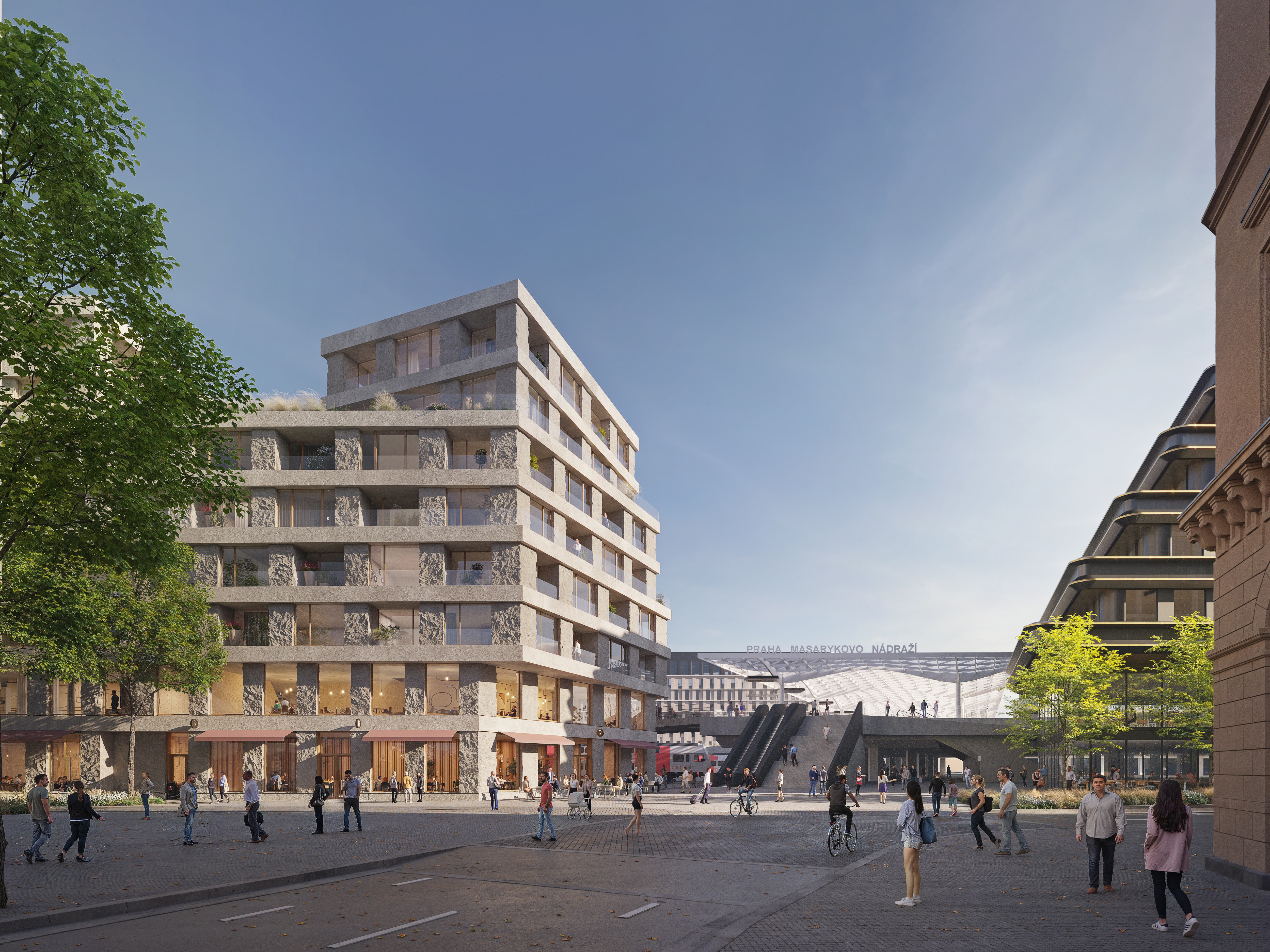The volumes are shaped into individual towers that gradually rise towards the main road (Magistrála). Each of the three buildings has its own specific expression reflecting its program and position within the site. The standalone residential building clearly defines the entrance to Na Florenci street and the Masaryk Railway Station platform. Receding stone slabs form private terraces and loggias.