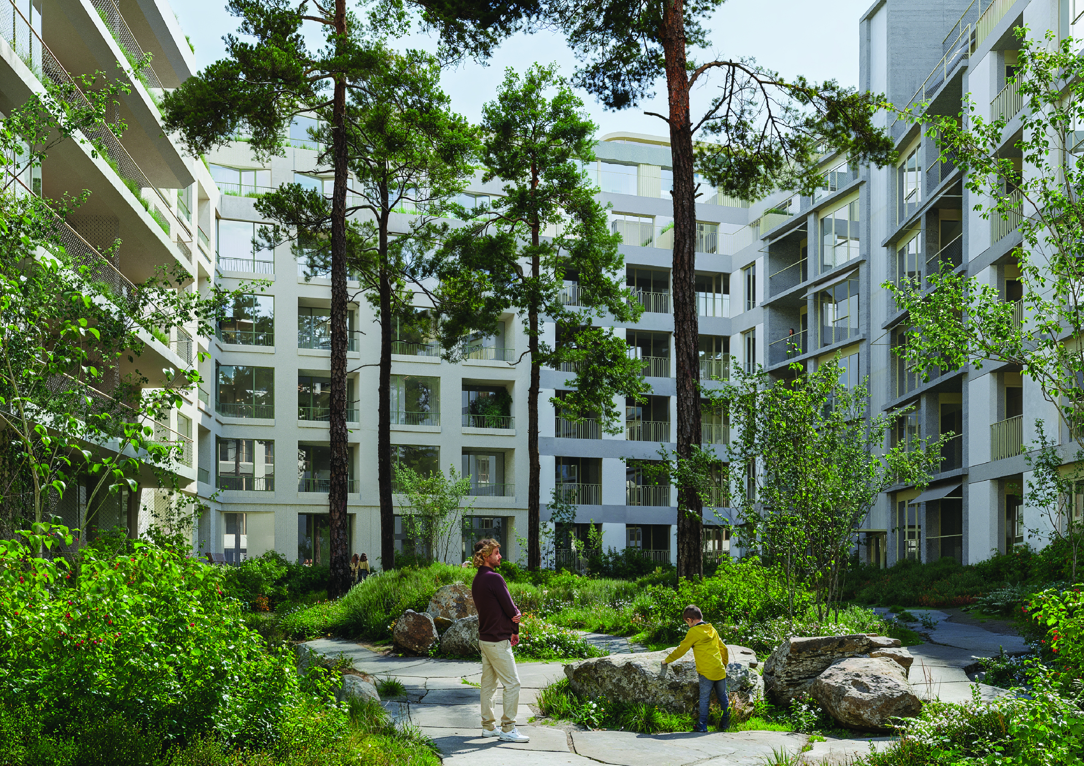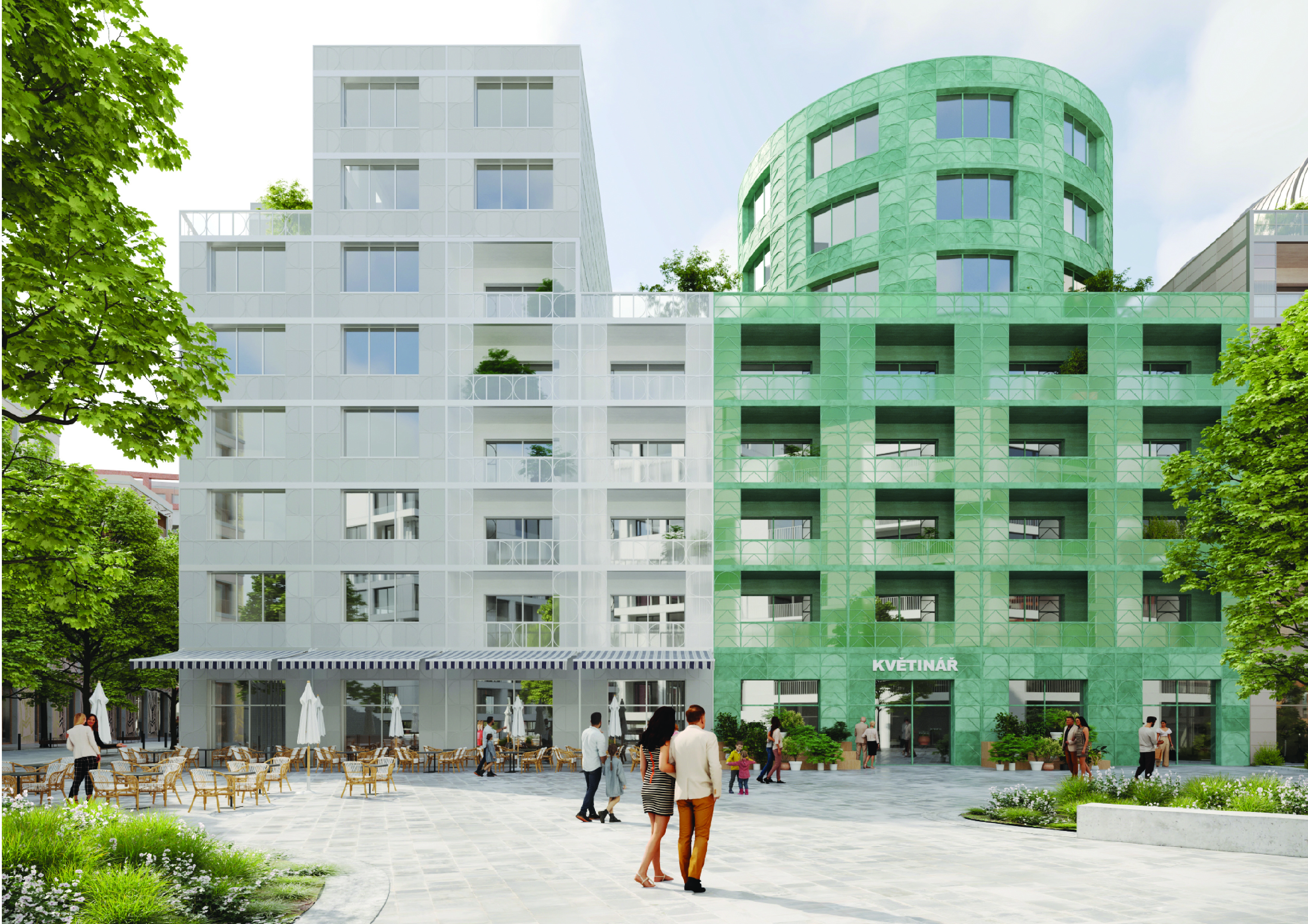 Konstrukční soudržnost celku podtrhuje společný „obytný plášť“ ze skleněných panelů, které jemně filtrují světlo a přepisují tradiční barevnost pražských fasád do proměnlivé, prosvětlené podoby. Uprostřed vnitrobloku se nachází zelený lesík s podloubím po obvodu, jenž zlepšuje mikroklima a vytváří živý, proměnlivý prostor podporující setkávání a mezigenerační soužití.
