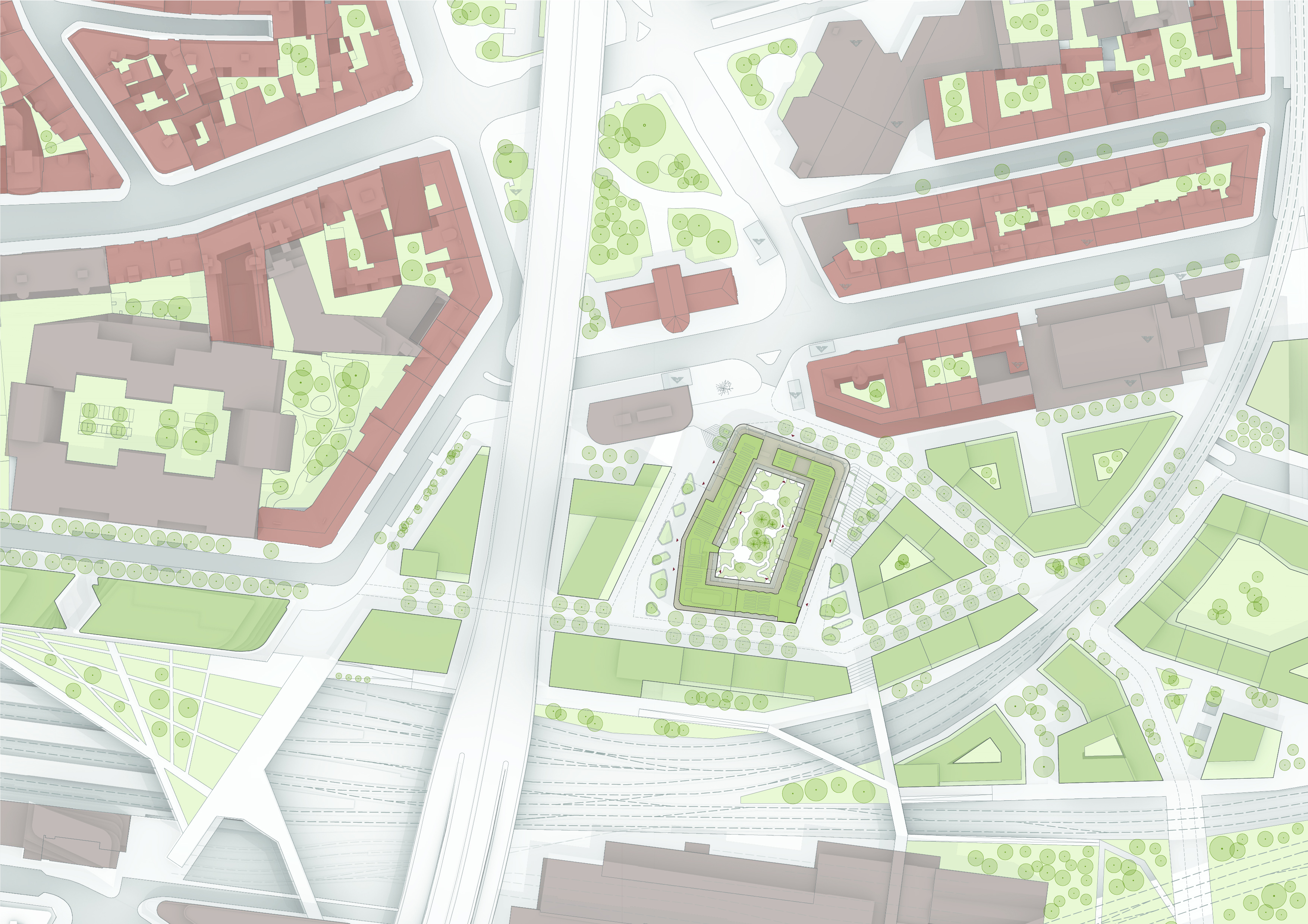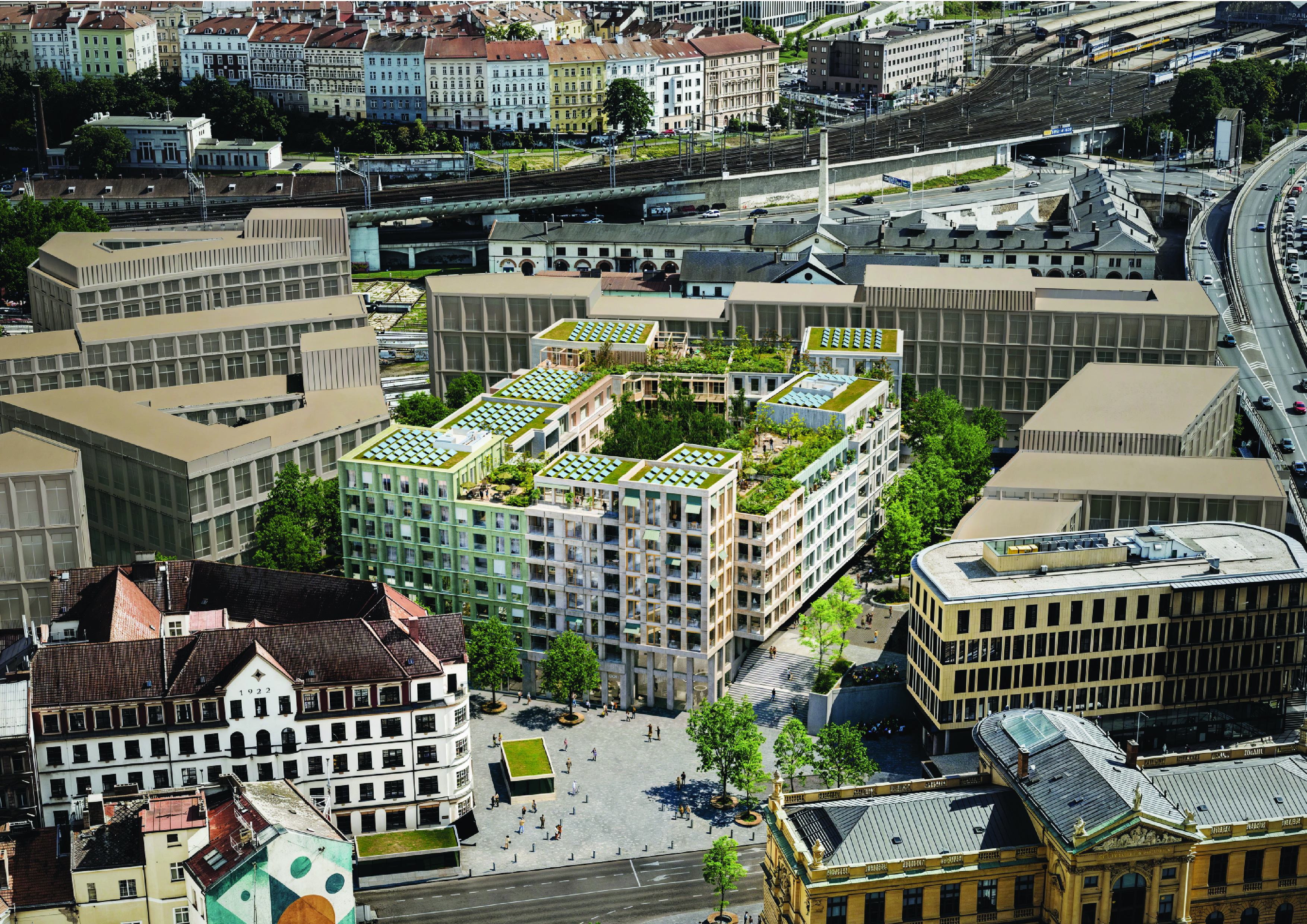 PRAŽSKÝ BLOK– návrh vychází z tradice pražského činžovního domu. Každý dům má svou identitu vycházející z materiálu a vzhledu, avšak celek spojuje jednotný soubor pravidel, který zajišťuje architektonickou soudržnost a zároveň umožňuje rozmanité interpretace v detailech.