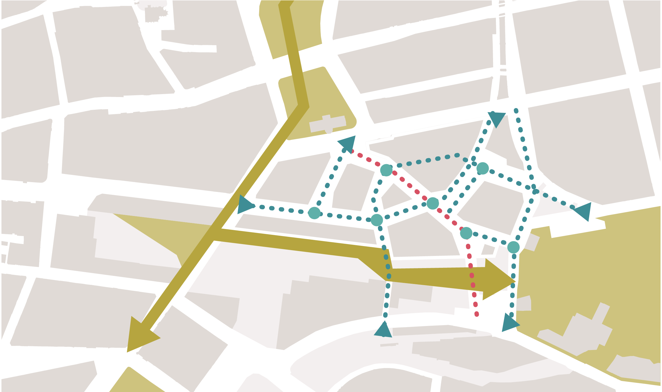 Instead of one central square, a network of smaller, connected spaces creates a lively, walkable neighbourhood where public life flows through a variety of inviting places.